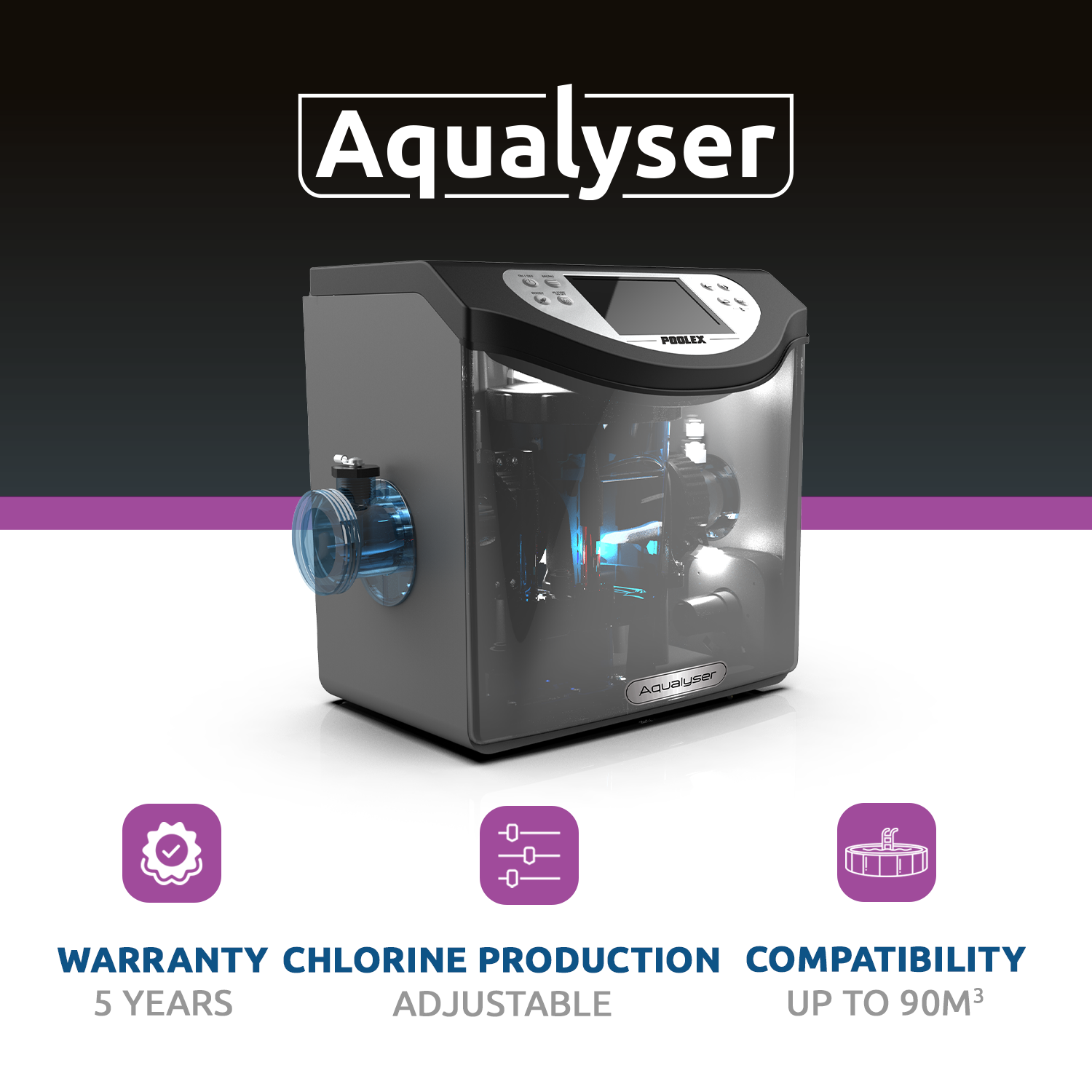 However, the titanium cell in the Poolex Aqualyzer offers even greater longevity, with a guarantee of 10,000 hours of operation. Automatic polarity reversal options also extend life by reducing limescale deposits.