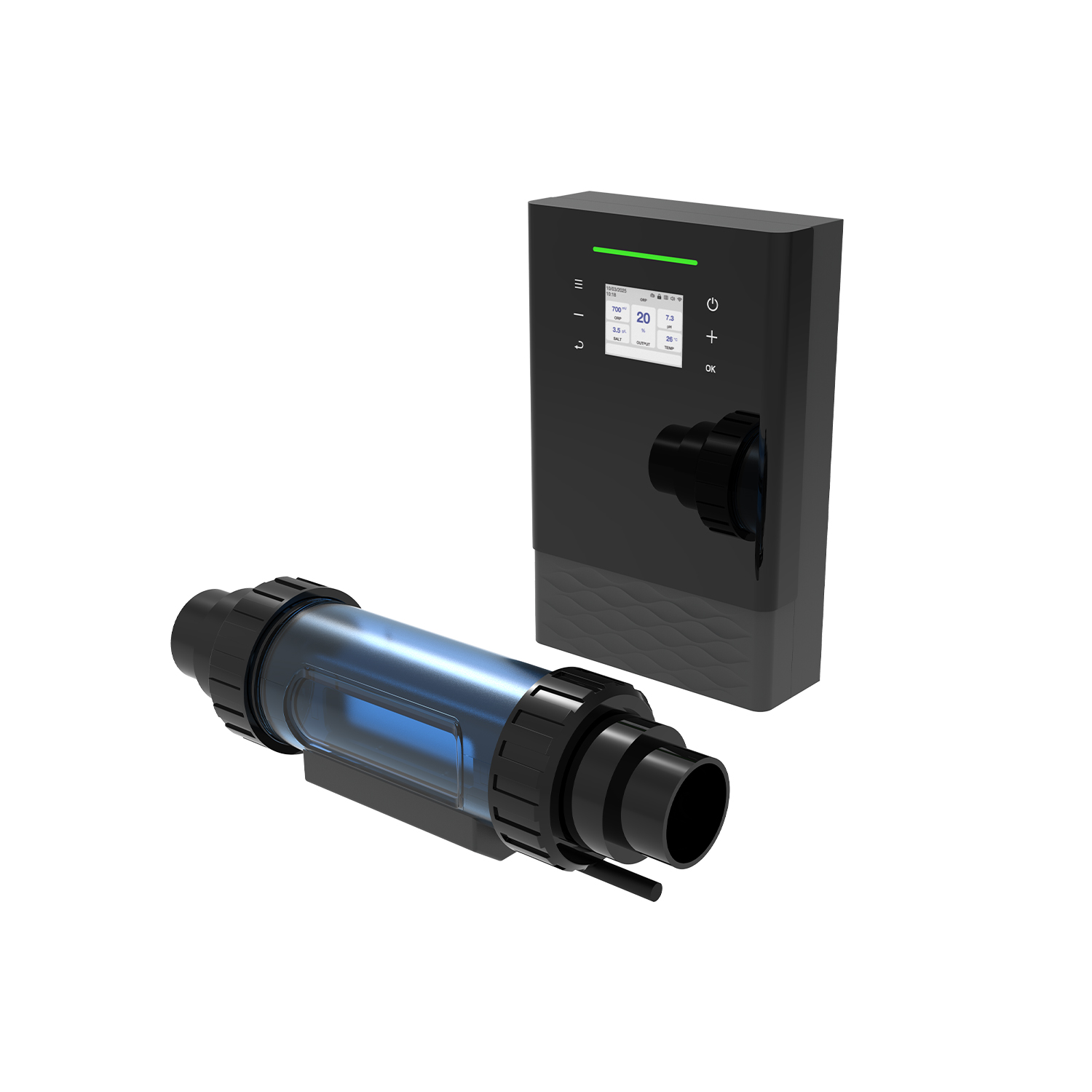 | Fonctionnalités | Pilotage de la pompe de circulation (contact sec). Adaptation de la production en fonction du volet (contact sec). Interface multilingue. Compatible avec kit sonde ORP en option. |